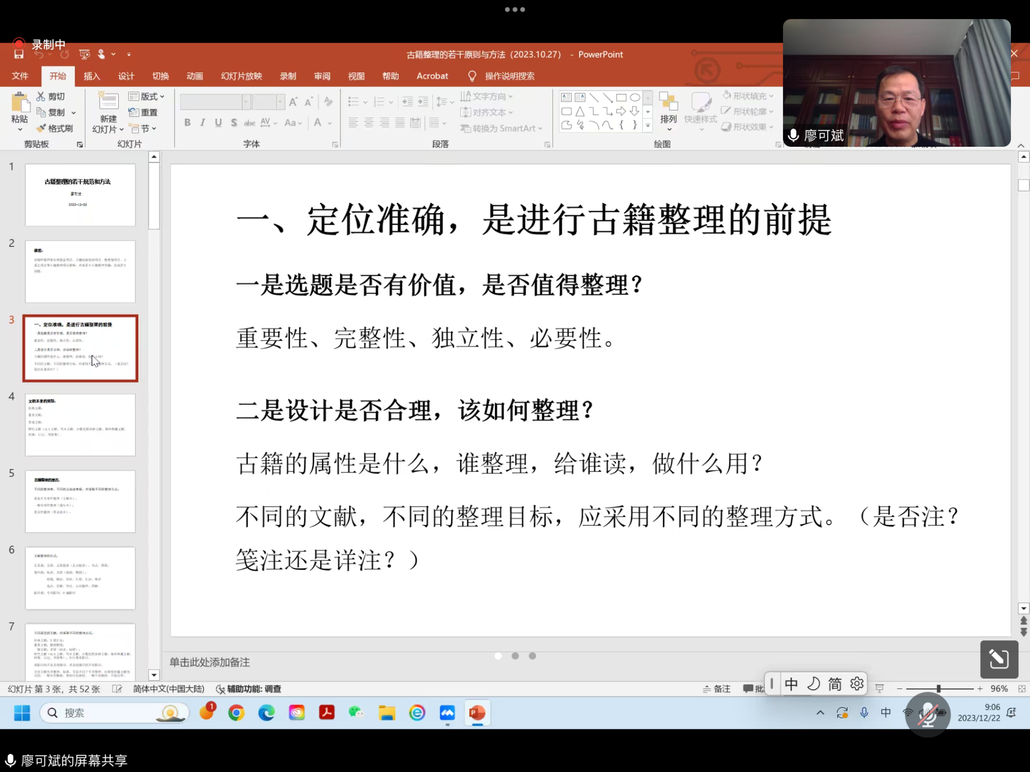 本次讲座,廖可斌教授从选题到具体操作,系统梳理了古籍整理工作的要点。他首先强调,由于不同类型的文献需要不同的整理目标,因此应采用不同的整理方案。在选题阶段,判断文献的类型、准确定位整理的层次以及有针对性地设计古籍整理的形式至关重要。廖可斌教授特别指出,大型文献丛书的整理与专书整理的标准和方法存在差异,因为大型文献丛书的整理主要是为了保存批量文献。